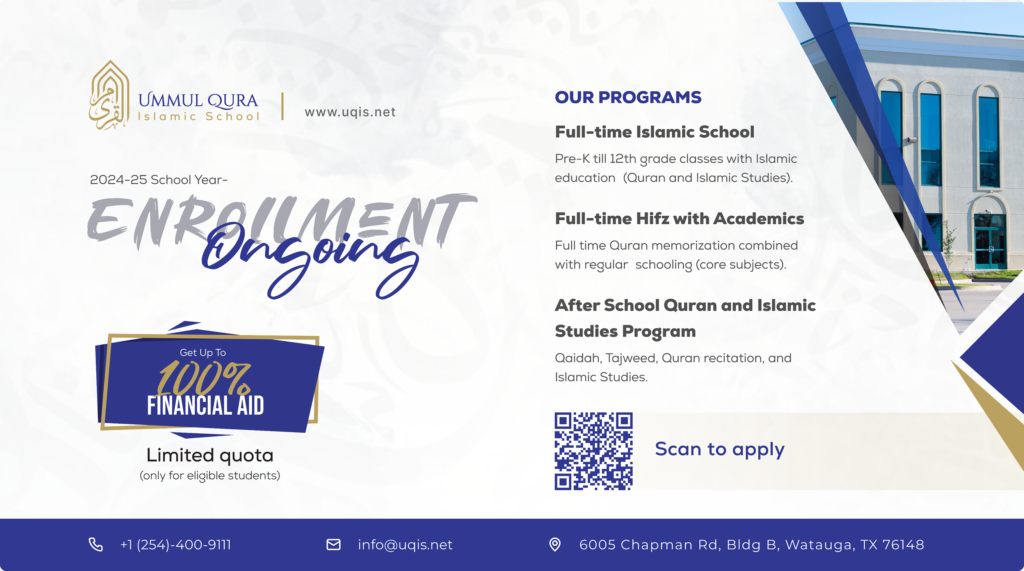 Ummul Qura Islamic School was established in 2023 in Watauga, Texas. Alhamdulillah, Ummul Qura Islamic School is progressing in its goal day by day with its dedicated team. Our vision is to cultivate an educated and devout community, fostering a better world while embracing true servitude to Allah. In the midst of worldly turmoil, our sole beacon for elevation remains in Allah’s guidance and the Prophet’s Sunnah.